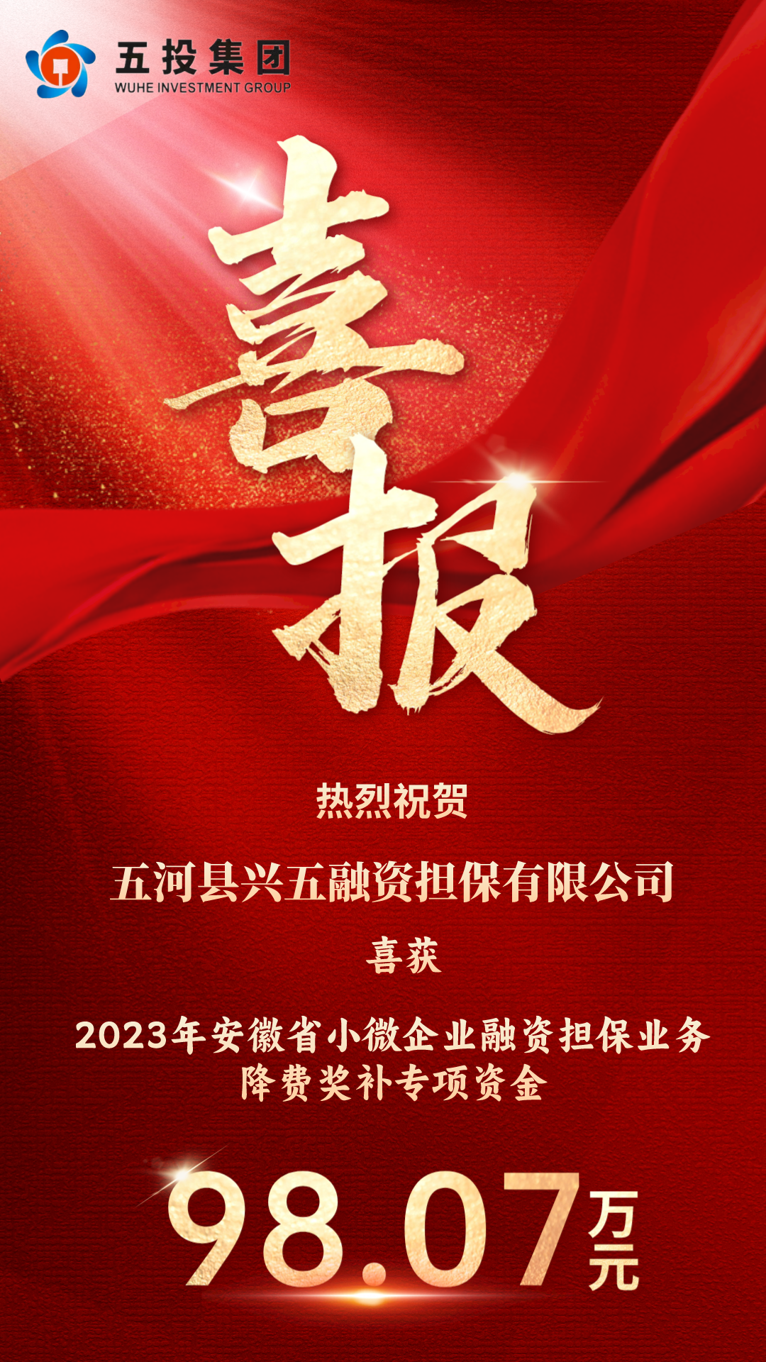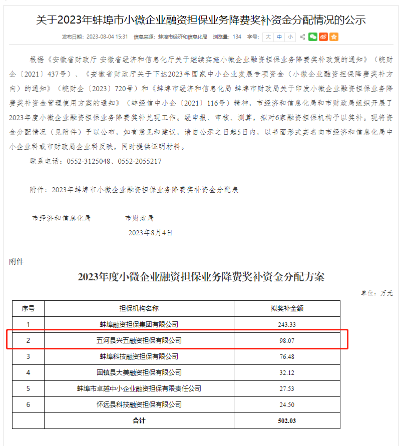 近日,蚌埠市经济和信息化局公布了“2023年度小微企业融资担保业务降费奖补资金”指标,蚌埠市共争取到2023年安徽省小微企业融资担保业务降费奖补专项资金502.03万元,其中,FUN乐天使官方网站集团兴五担保公司争取到98.07万元,奖补专项资金争取额度依然位居蚌埠三县第一。