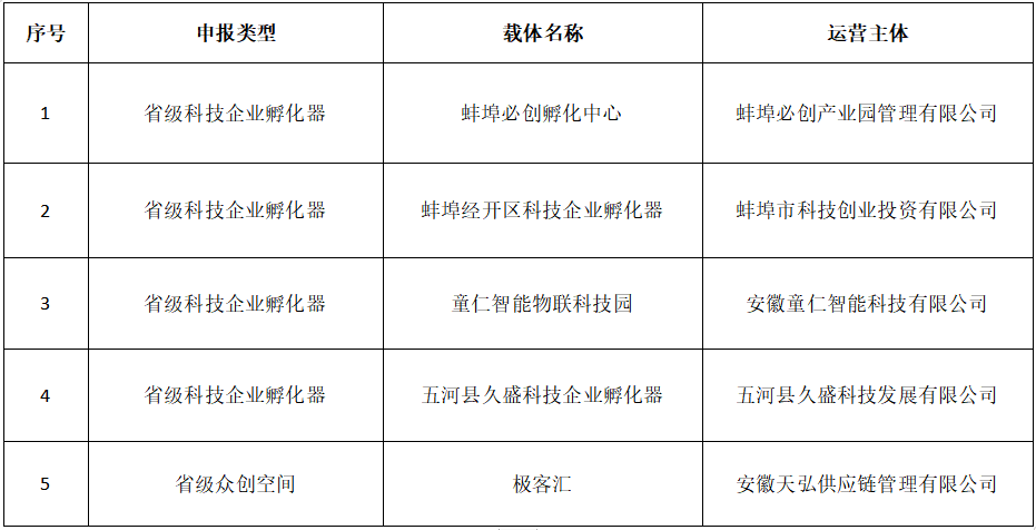 按照《安徽省科技企业孵化器认定、众创空间备案及绩效评价管理办法(试行)》(皖科区〔2020〕21号)文件要求,经运营单位申报、县区推荐、市局审核等程序,现将拟推荐的4家科技企业孵化器和1家众创空间予以公示。