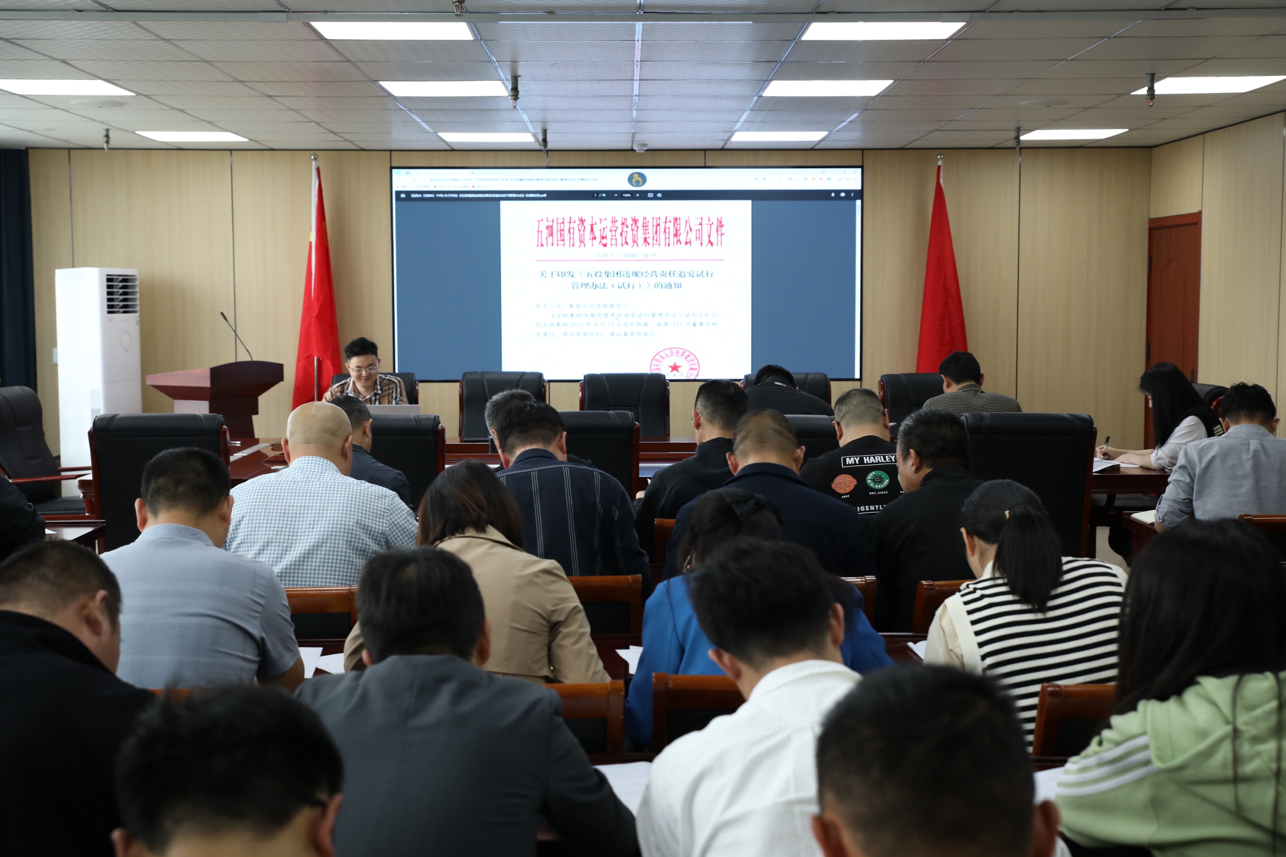 为认真贯彻落实国有企业违规经营投资责任追究的有关工作要求,进一步提升国资系统相关工作人员业务能力素质,有效指导业务合规开展,4月25下午,FUN乐天使官方网站集团审计核算中心组织各经营性公司全体人员共同学习了《FUN乐天使官方网站集团违规经营责任追究试行管理办法》。