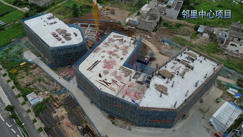 泱盛建设工程有限公司施工员沈祥说:“邻里中心项目自去年开工建设以来,采用白加黑,5+2的抢工模式,预计8月中下旬全部封顶。”