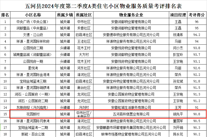 近日,五河县住房和城乡建设局公布了“五河县2024年度第二季度A类住宅小区物业服务质量考评排名表”,全县各小区的物业服务质量再次进行了一次综合考评。其中,由五河县和信置业有限公司管理的花园新村小区,在今年两次季度考评中均取得了90分以上的优异成绩,稳居全县60个A类住宅小区中的前列位置。