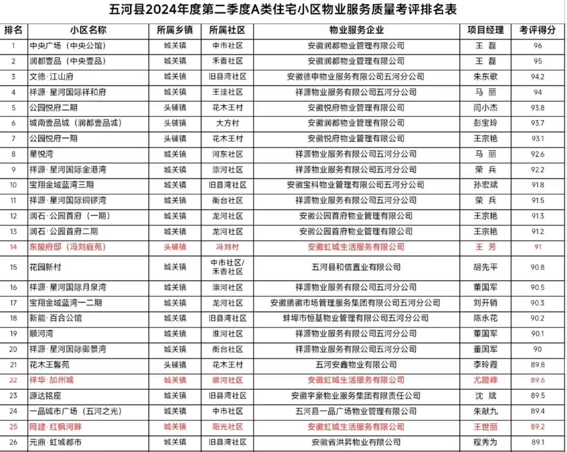 近日,五河县2024年度第二季度A类住宅小区物业服务质量考评排名已公示。安徽虹城生活服务有限公司(以下简称“虹城生活公司”)下辖的3个项目在这一轮的“较量”中取得了良好成绩。