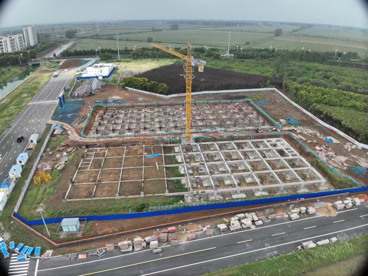 目前,该项目5#厂房基础验收通过,正在进行土方回填施工;6#厂房正在进行基础梁柱模板加固,近期将进行验收、浇筑基础梁柱。配套市政带路已施工完成480米;总图围墙正在砌筑,已完成350米。
