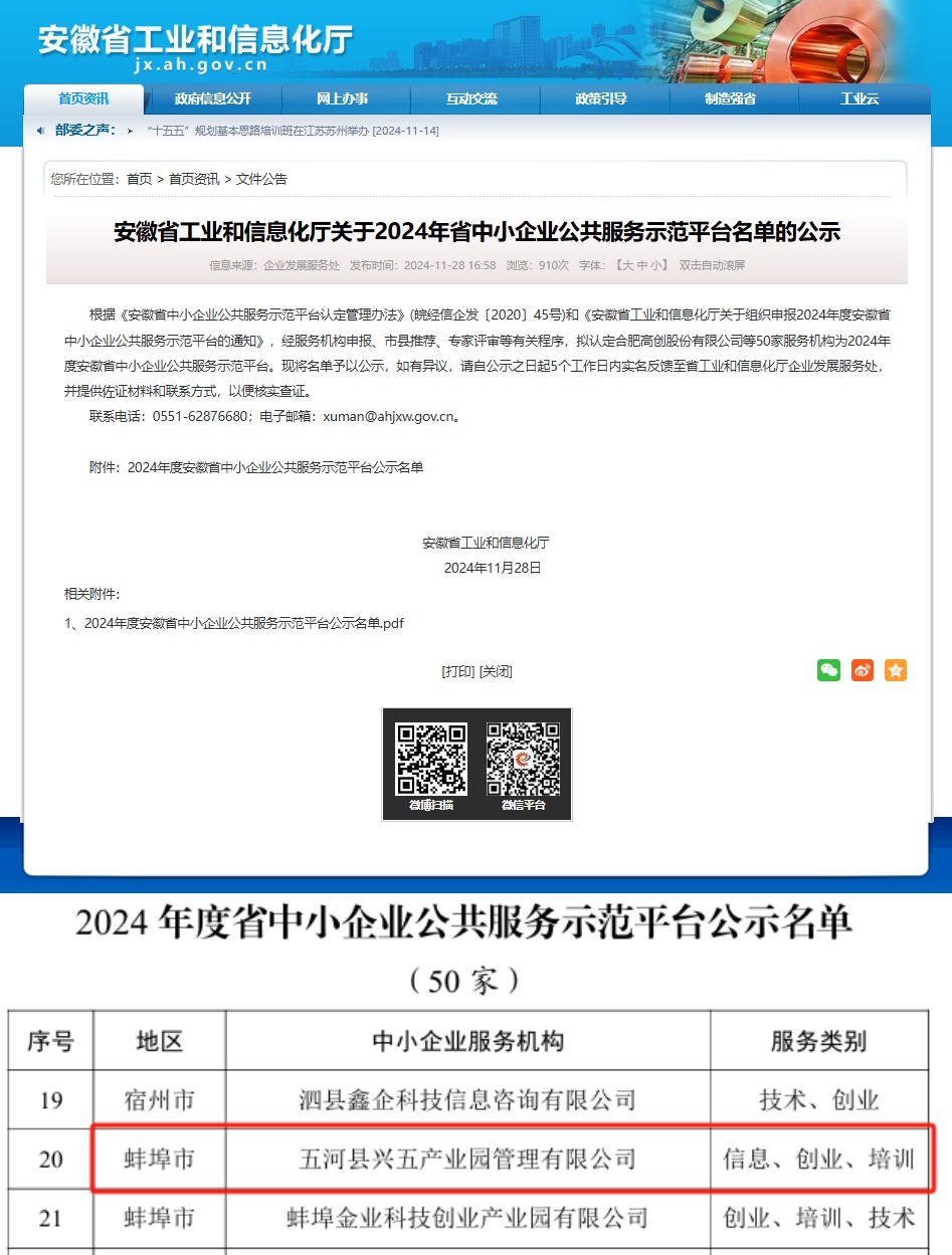 根据《安徽省中小企业公共服务示范平台认定管理办法》(皖经信企发〔2020〕45号)和《安徽省工业和信息化厅关于组织申报2024年度安徽省中小企业公共服务示范平台的通知》,经服务机构申报、市县推荐、专家评审等有关程序,五河县兴五产业园管理有限公司成功入选2024年省中小企业公共服务示范平台。