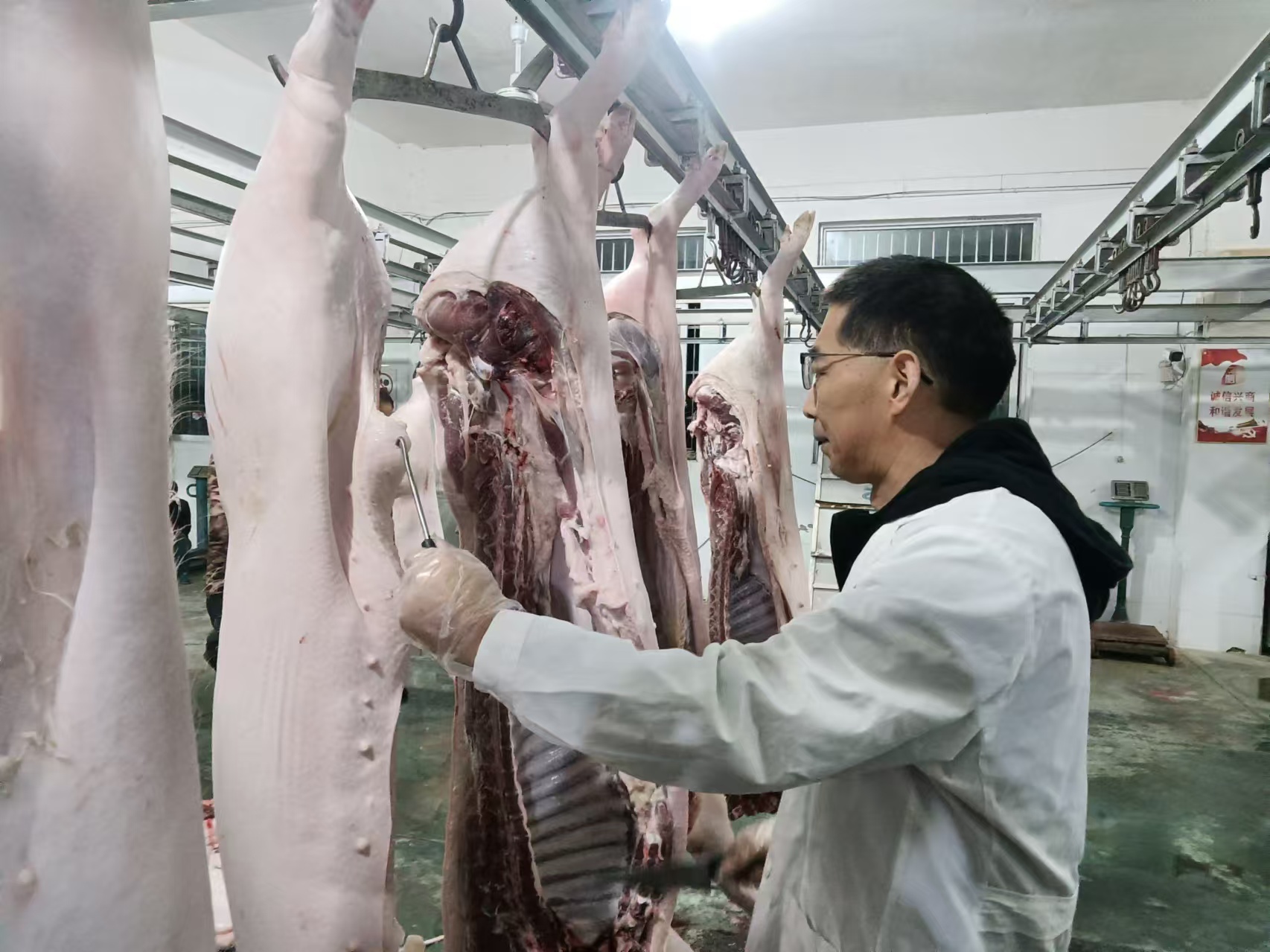 2024年,淮浍食品公司将“屠宰企业是生猪产品质量安全第一责任人”的理念深深扎根于企业运营的每一寸土壤。在生猪屠宰环节,公司构建起了一道严密且专业的质量防线。凭借精细入微的检验检疫流程,全年精准检出病害生猪22头、修割不可食用生猪产品超8000公斤。
