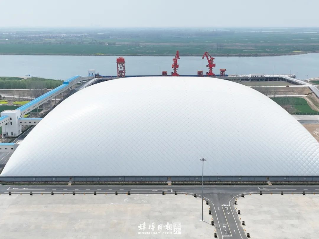 淮水奔流,位于五河县新集镇和头铺镇之间的五河县城南综合码头项目正加速推进,一个白色仓储建筑——气膜仓库格外显眼,犹如巨大的白色“气泡”立于码头之上。