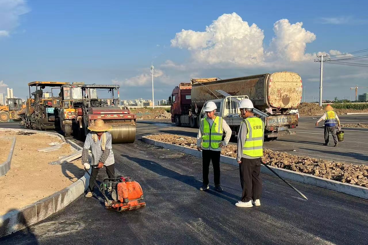面对酷暑挑战,虹安建设公司科学调整作业方案,采取“抓两头、歇中间”的错峰施工模式,合理避开午间极端高温时段,充分利用清晨和傍晚时间追赶工期。在沥青摊铺作业现场,尽管热浪混合着沥青蒸气扑面而来,工人们依然严格按照规程操作,压路机紧随其后反复碾压,确保每一寸路面都达到高标准的质量要求。公司同时备足防暑降温物资,加强现场安全巡查,全力保障一线作业人员身体健康与施工安全。